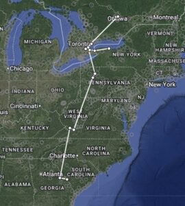 Most of the hawks we band continue their journey eastward around Lake Ontario. This one decided to go west over the Niagara Peninsula before her last spring detection north of Ottawa on May 11. We don’t know how much further north she may have gone. On Sept 30, she was detected heading south at Bronte Creek Provincial Park, just north of Hamilton. From there she continued to the southeastern U.S. with her last detection (to date) being on Nov 4.
