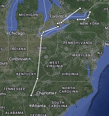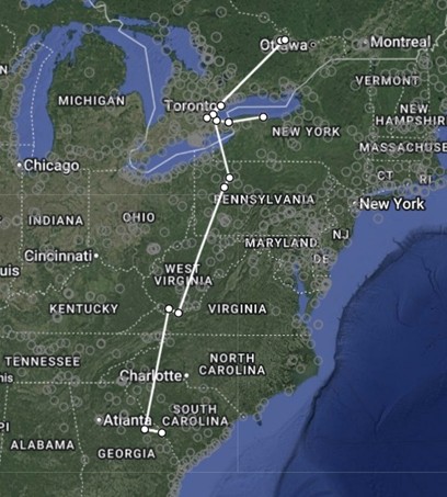 Most of the hawks we band continue their journey eastward around Lake Ontario. This one decided to go west over the Niagara Peninsula before her last spring detection north of Ottawa on May 11. We don’t know how much further north she may have gone. On Sept 30, she was detected heading south at Bronte Creek Provincial Park, just north of Hamilton. From there she continued to the southeastern U.S. with her last detection (to date) being on Nov 4.